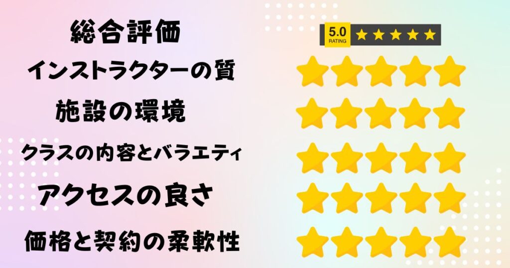 *総合評価はインストラクターの質・施設の環境・クラスの内容とバラエティ・アクセスの良さ・価格と契約の柔軟性の5つの評価項目から1年以内の口コミを参考に算定しています。